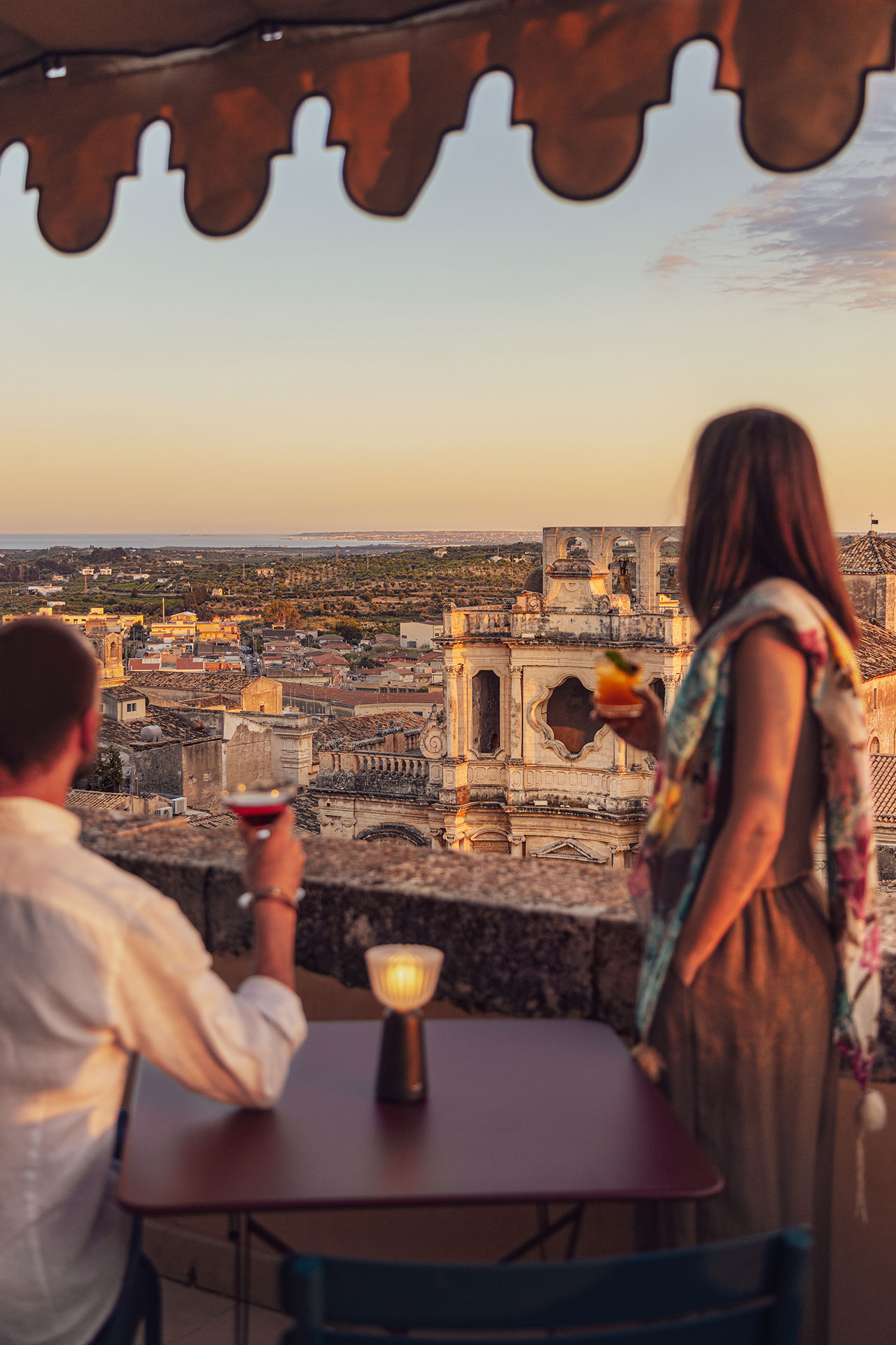 C’è un momento, quando il sole comincia a scendere e l’aria si tinge d’oro, in cui la Sicilia sembra sospesa tra sogno e realtà. E non c’è luogo più incantevole da cui ammirarlo che la terrazza privata del Principe di Villadorata: un angolo segreto, nobile e senza tempo, che domina il cuore barocco di Noto.